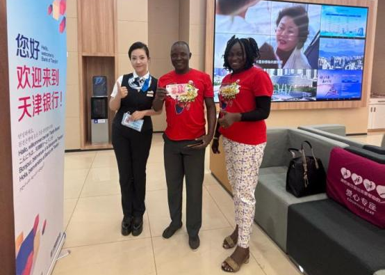 exchange,Sir?”“ 1000 dollars,please,we are going to go shopping.”我有些犹豫地回答道。经过沟通工作人员了解到我们刚到中国,想换一些人民币,同时对中国人使用手机支付也感到很新鲜,也想尝试但不知道怎么办,工作人员热情地帮助我开立了我到中国的第一张银行卡,并指导我将卡绑定了支付宝及微信,当我尝试着给同伴用微信转账成功后,我兴奋地拥抱着同伴说:“太方便了,一会儿我请客”。工作人员还帮我们兑换了不同面额的人民币“零钱包”,并讲解了“零钱包”的使用方法,面额区分以及辨别人民币真假的基本技巧。我开心地伸出大拇指,说道“第一次来中国,我们以为办卡和兑换人民币过程很繁琐,需要提供很多证件,没想到这么轻松快速地就能办好,你们的服务真的太好了,太感谢了!我们喜欢中国!我要在天津多住些日子!”我因为工作需要今后要经常往返于天津和刚果,看到身边的朋友经常使用手机扫码支付很方便,所以我也想这样支付,但是不知道怎么办理。于是我来到了天津银行官银号支行,向工作人员诉说了自己的诉求。工作人员为我展示了《外籍来津人员支付服务指导》《境外来华人员支付指南》并耐心细致的跟我讲解了移动支付、银行卡绑定支付宝和微信的操作流程。