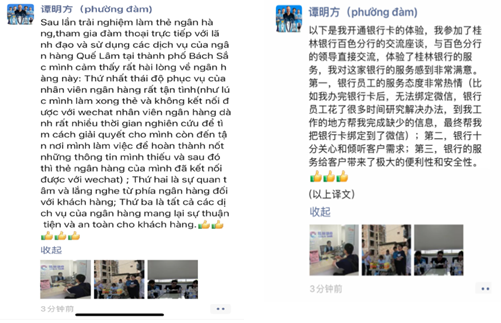有些支行周边有多所中小学,每天经过支行大门的学生和家长较多。支行工作人员积极进行优化支付服务宣传,路过的家长表示:“平时会给孩子一些零花钱,由孩子自由支配购买零食、文具等物品,让孩子从小对物价有一定认知,树立正确的金钱观,并养成记录自己开销的好习惯,但时常也会因为没有零钱感到苦恼”,路过的学生表示:“老师不允许带手机到学校,所以只能用现金支付,手上经常有一些皱巴巴的现金,会遇到有的商家说钱太旧了或者找不开的情况”。了解到学生和家长的支付需求后,支行工作人员主动介绍“零钱包”兑换服务,从柜员手里接过这个圆鼓鼓的零钱包后,小朋友们都爱不释手。桂林银行秉持“漓水春风”的服务理念,真心对待每一位客户。一名来自越南的留学生客户,想要在我行网点体验国内的移动支付服务。根据我行“简易开户”的原则,很快帮助其办理了桂林银行储蓄卡,并指引其在微信支付中绑定银行卡,但在绑定时系统提示个人信息有误,经过反复核实无误后,客户经理立即联系到总行信息技术部,并且同步协助客户联系微信客服。当时客户表明学校有课程后就离开了,但是客户经理为满足客户需求,继续与总行信息科技部进行沟通,得知原因是微信APP预留姓名大小写录入错误后,利用午休时间联系这名客户,上门为其修改信息,完成绑定。之后邀请该名留学生参加我行的外籍人员座谈交流会,一起参观我行乡村振兴示范路线,该客户对我行的真诚服务所感动,主动在朋友圈分享自己的经历与感受。